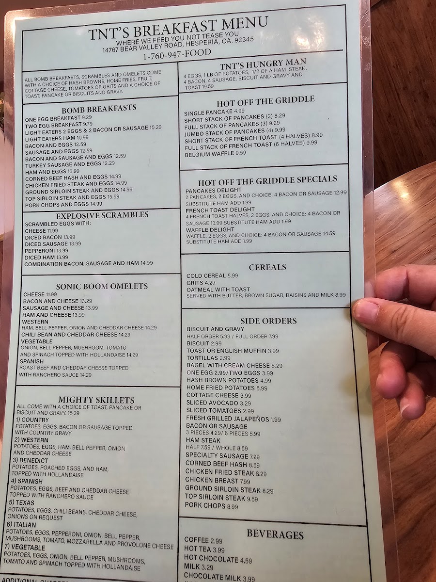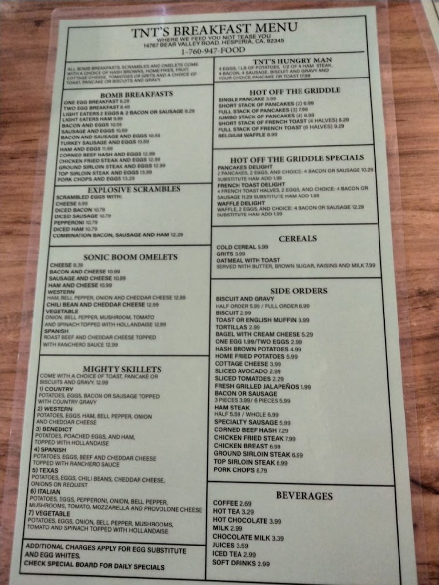 If you're in Hesperia and searching for a cozy spot to kickstart your day, look no further than TNT's Cafe. Nestled at 14767 Bear Valley Rd, this charming little cafe stands out as a true gem amongst the usual dining options. With a reputation for hearty home-style breakfasts and a warm, inviting atmosphere, TNT’s Cafe is where comfort food meets friendly service.